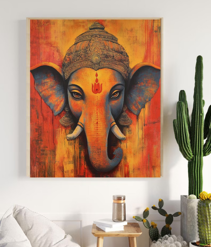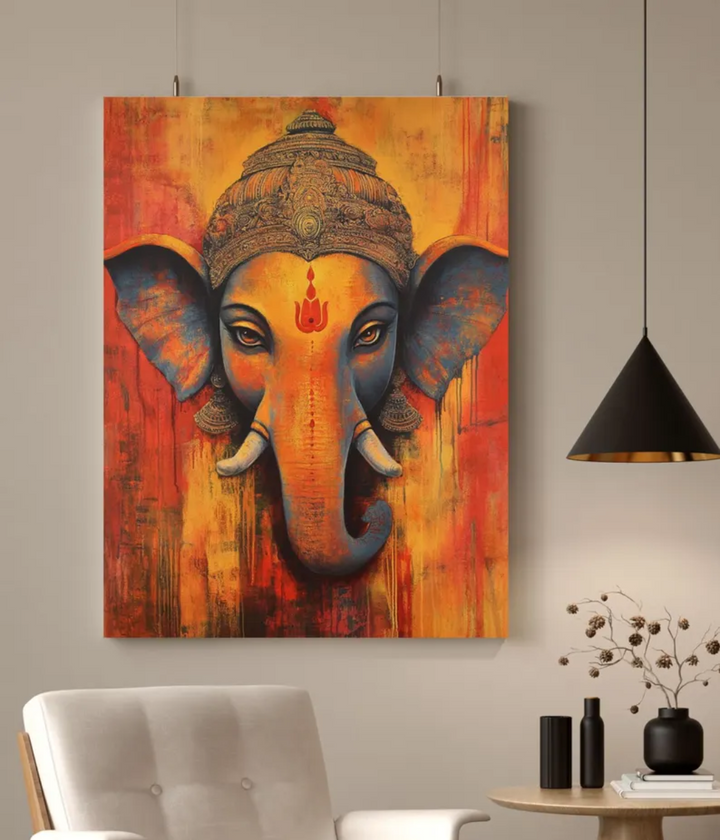 Lord Ganesha Painting Wall Art showcases the remover of obstacles in stunning artistic detail, blending vibrant colors with spiritual symbolism. Printed on premium, fade-resistant canvas and framed for durability, it brings peace, prosperity, and positive vibes to any space. Perfect for living rooms, pooja rooms, or offices, and an ideal gift for housewarmings and festive occasions.