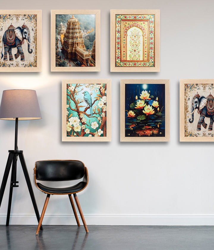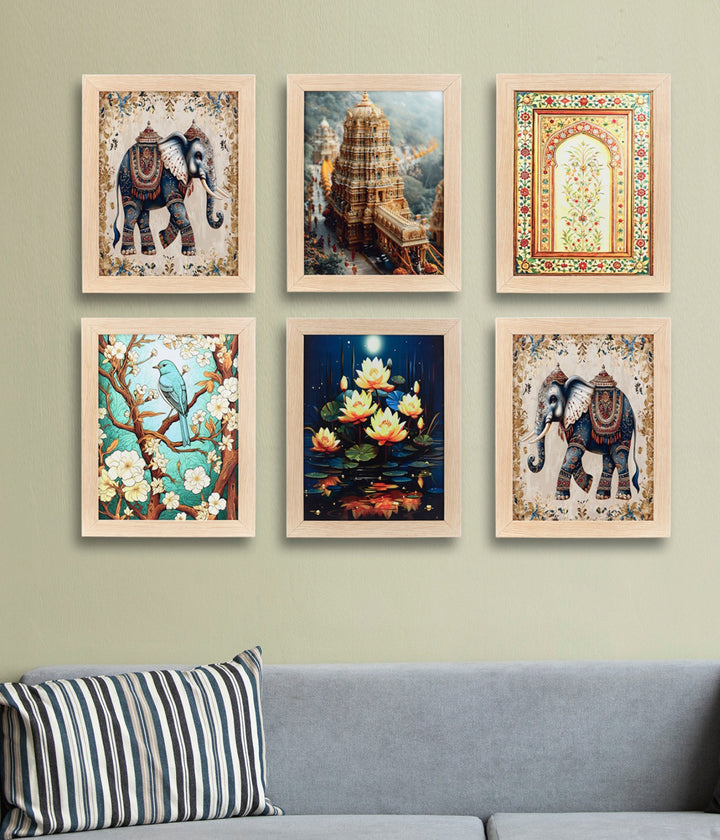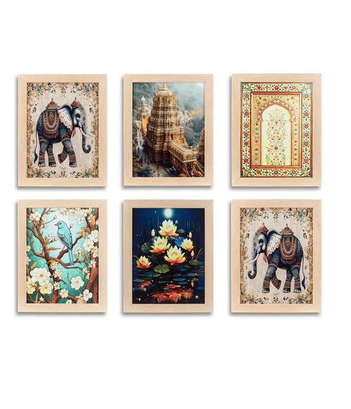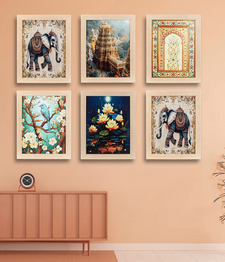 Regal Heritage Bloom – Canvas Painting Set of 6 Frames beautifully blends royal elephants, majestic temple architecture, serene lotuses, and vibrant nature scenes. Crafted with premium, fade-resistant prints on sturdy wooden frames, this set brings a touch of tradition, elegance, and cultural charm to your walls—perfect for enhancing your living room, bedroom, hallway, or office décor.
