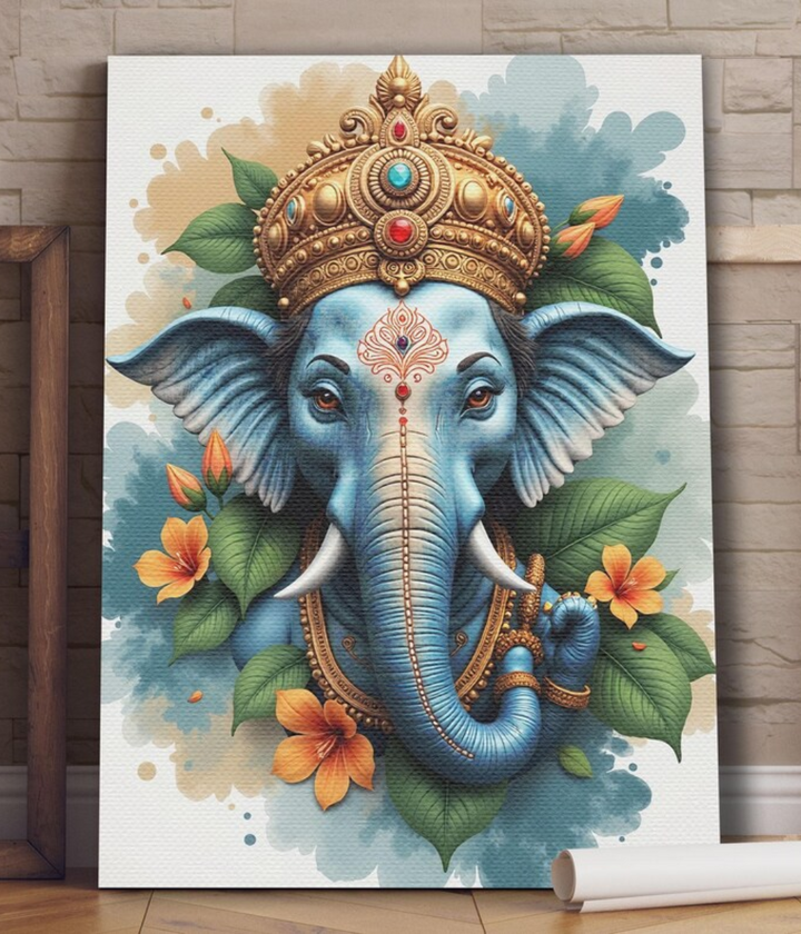 This Royal Blue Lord Ganesha Floral Wall Art Canvas will bring elegance and tranquility to your room. It features an exquisitely detailed Ganesha with a lavish crown and colorful flowers, signifying peace, prosperity, and knowledge. This artwork, which combines divine appeal with modern elegance to create a stunning décor statement, is ideal for living rooms, bedrooms, or meditation areas.