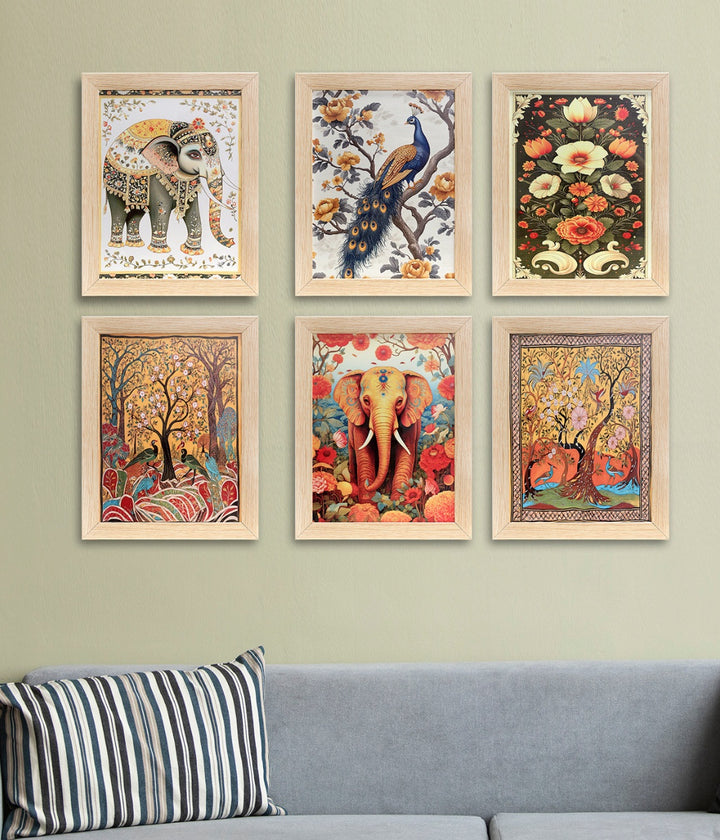 Royal Wildlife Harmony – Canvas Painting Set of 6 Frames blends majestic elephants, graceful peacocks, and vibrant nature scenes into a captivating wall décor collection. Each canvas is printed in rich, fade-resistant colors and mounted on sturdy wooden frames. Perfect for adding an elegant, cultural, and artistic touch to your living room, bedroom, or office space.